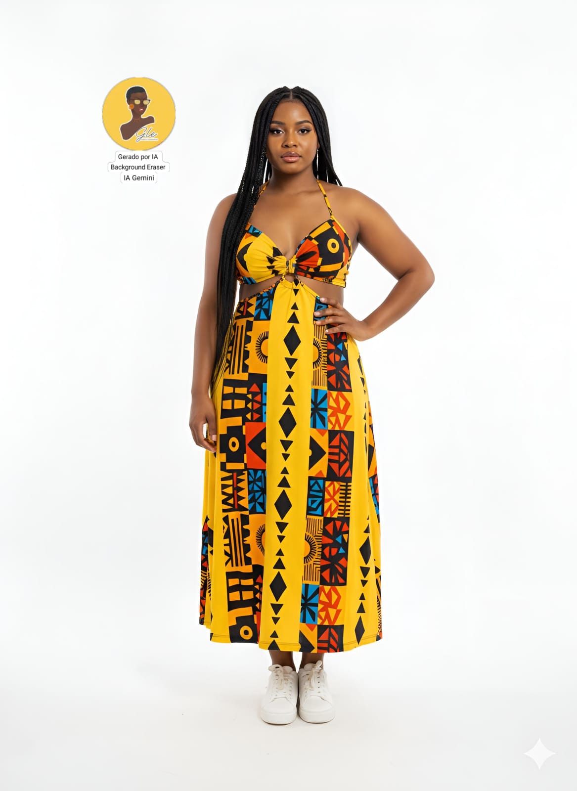 Vestido Longo Afro Cut Out Estampa Afro Multicolor Fundo Amarelo - Composição 96% Poliéster 04% Elastano
